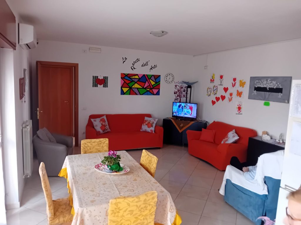 La cucina moderna, aperta sul soggiorno, è pensata per essere facilmente utilizzabile, con piani di lavoro a un’altezza ergonomica, elettrodomestici di ultima generazione e ampi spazi per muoversi liberamente. Il soggiorno adiacente è perfetto per momenti di relax o socializzazione, con comode poltrone e un’atmosfera calda e accogliente.